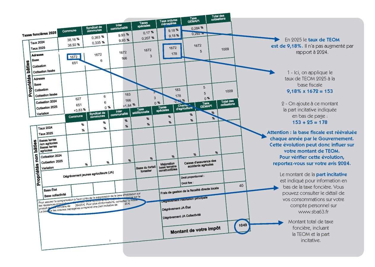 La taxe foncière indique le montant de TEOM (part fixe). Il est identique à 2024. A ce montant s’ajoute la part des levées et apports de 2024 (montant détaillé en bas de page). Pour suivre et vérifier votre consommation, rendez-vous sur votre espace privé.